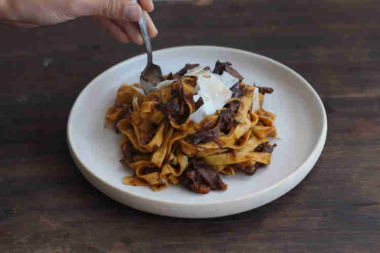 שבת גשומה וסוערת בחוץ. בא לי פסטה טעימה עם רוטב בשר ופטריות וערמונים ויין אדום וכל הדברים שהם הכי חורף. אבל אין מצב שאני יוצאת מהפיג'מה בקור הזה אז למה לא להכין "מנה של מסעדה", בבית? זאת אחת מהמנות שנראות סופר מורכבות, כאלה שאוכלים רק במסעדות, אבל תאמינו או לא היא ממש פשוטה להכין בבית! משחימים קוביות בשר עם ירקות שורש (גם אם יש לכם בבית רק בצל זה יעבוד מעולה, סלרי וגזר תמיד מוסיפים מאוד לטעמים אבל אפשר גם בלעדיהם) מוסיפים פטריות, ערמונים וקצת מהיין האדום שפתחתם לפני כמה ימים ונשאר חצי בקבוק שאין לכם מה לעשות איתו, מכניסים לתנור לכמה שעות וזהו! ואפשר גם על להבה נמוכה על הכיריים. החלק הכי קשה הוא לחכות שיהיה מוכן. אחרי שהבשר מתרכך לגמרי מפוררים אותו, מצמצמים קצת, מערבבים עם פפרדלה ויש לכם מנה משגעת! לא יאמינו לכם שהכנתם אותה לבד ולא הזמנתם טייק אווי ממסעדת יוקרה.