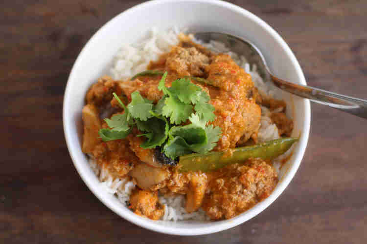* התבשיל יוצא חריף, אך לא מאוד בגלל המתיקות של הקוקוס שמאזנת את הטעמים. אם בכל זאת רוצים למתן את החריפות מורידים את כמו הצ'ילי ל-1.
